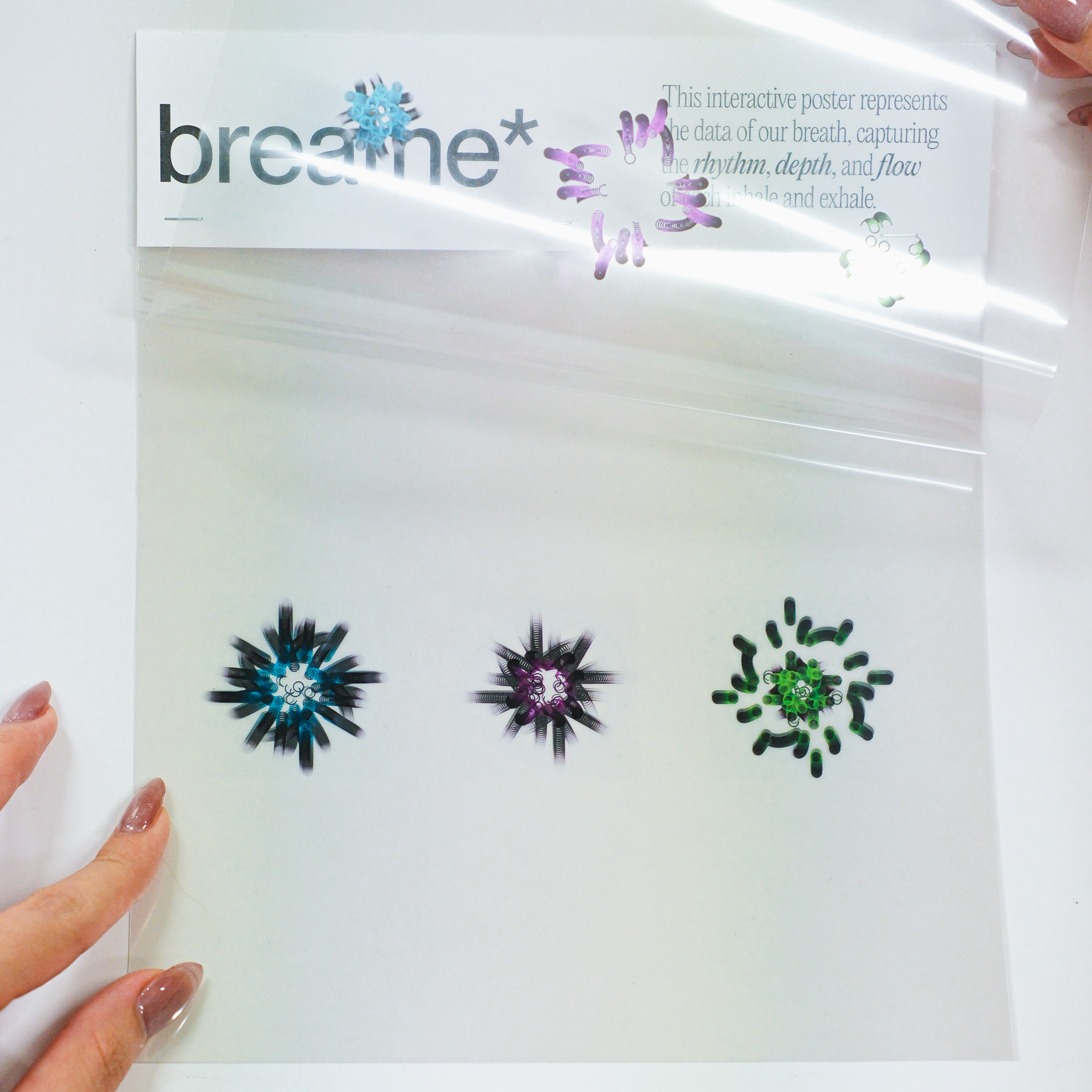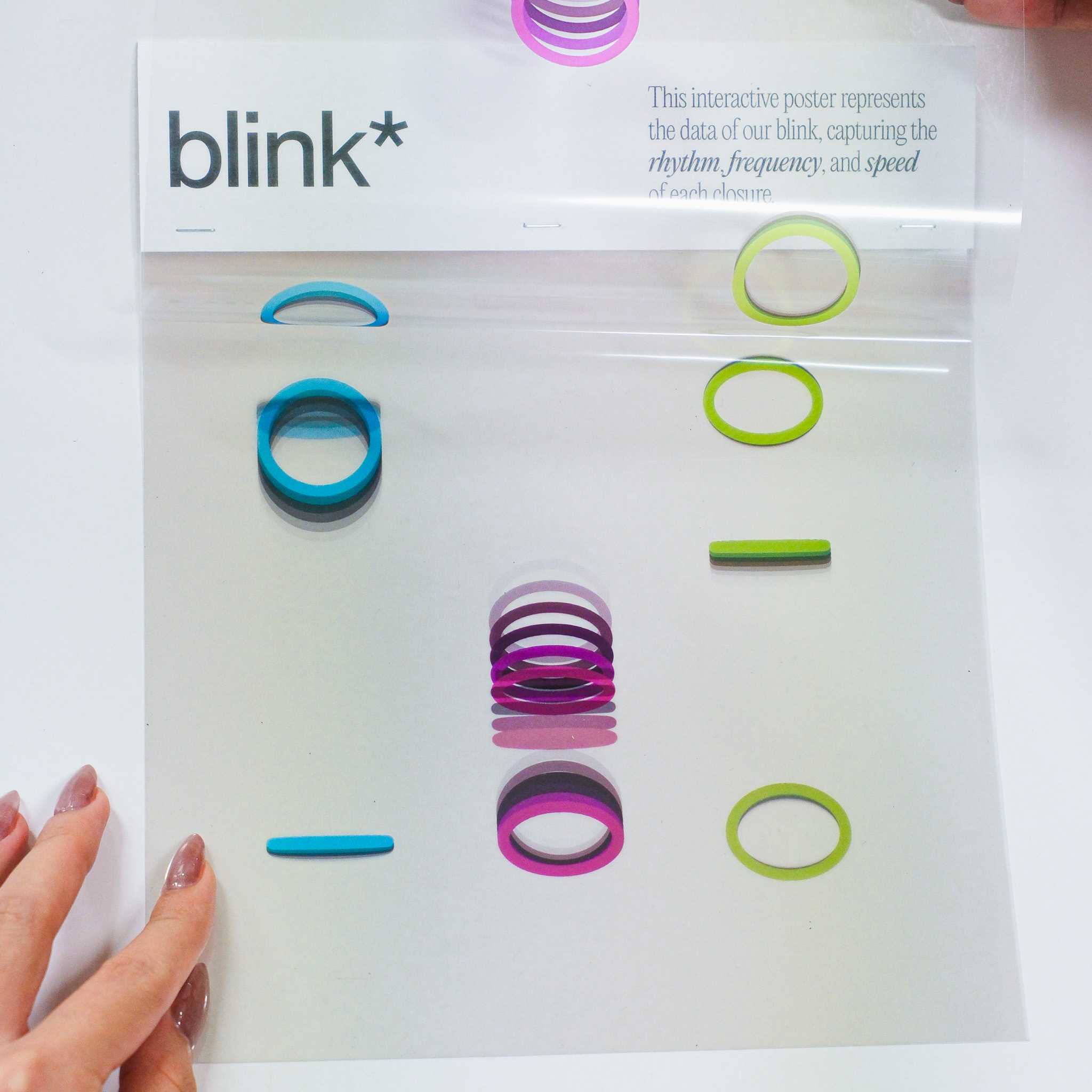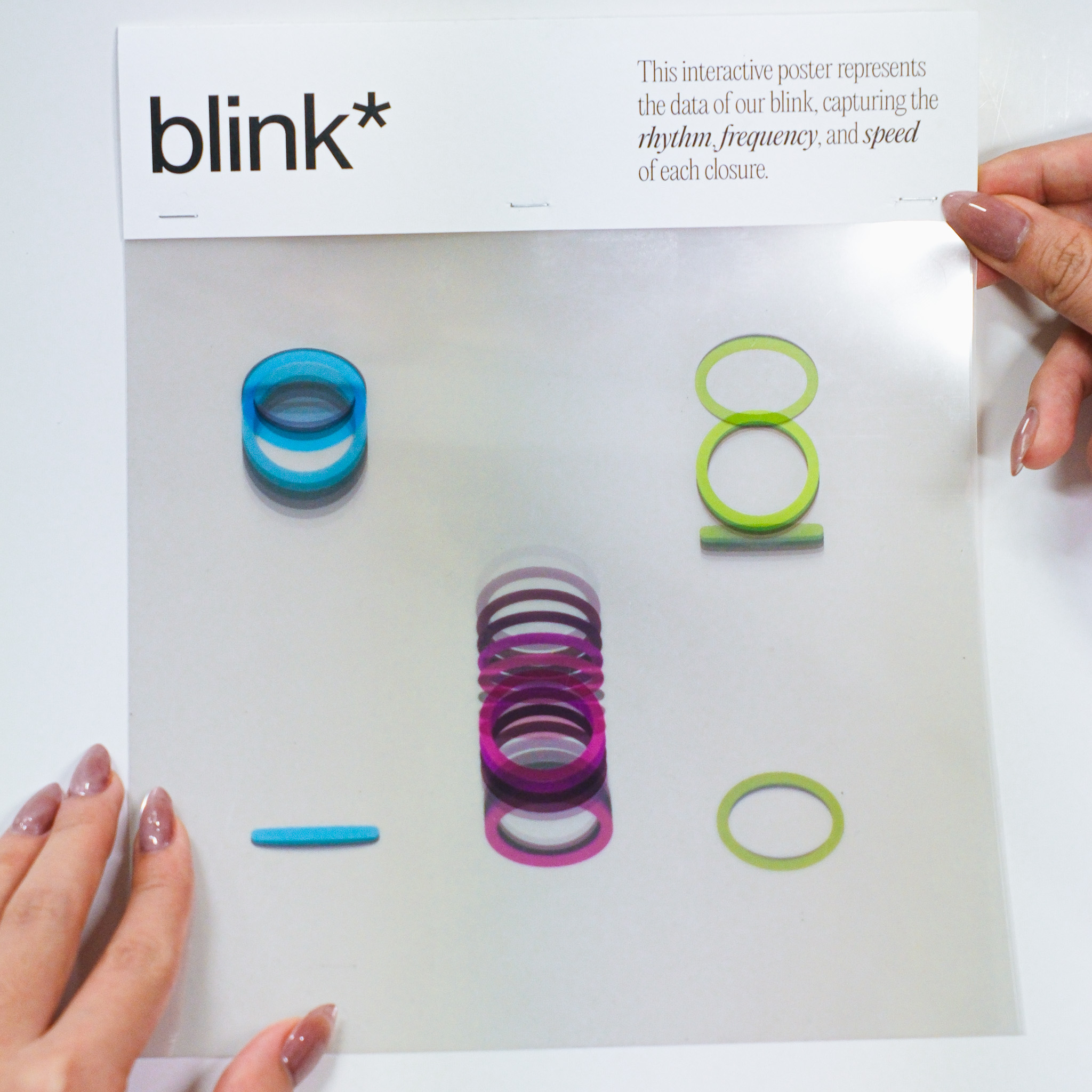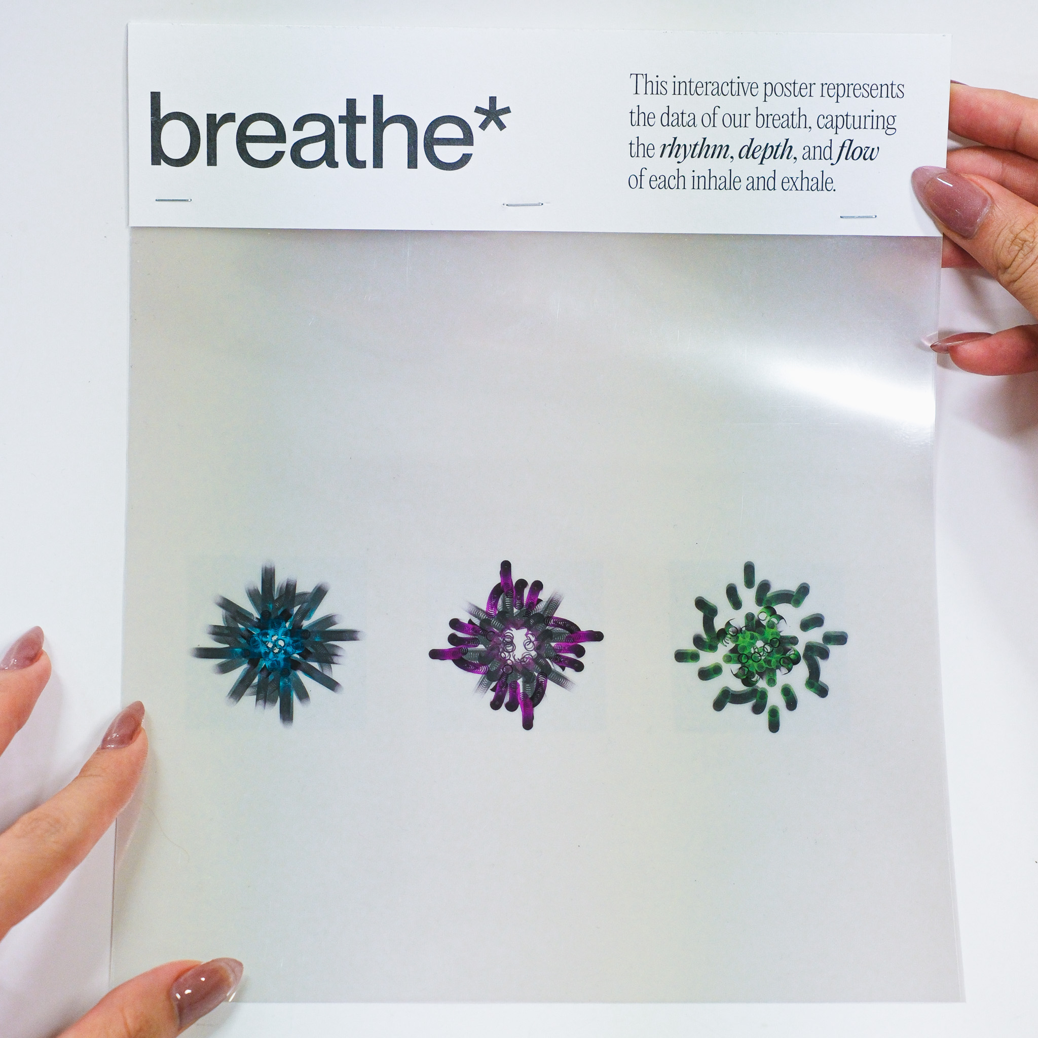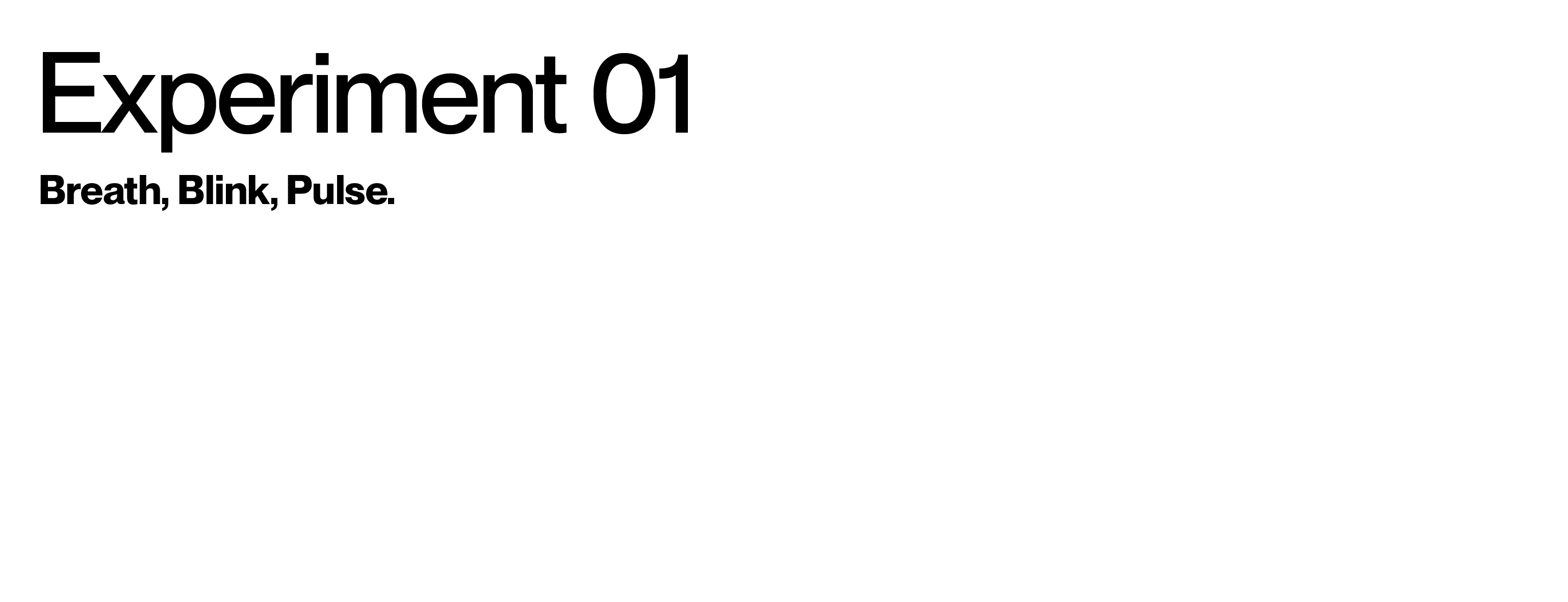 This experiment transforms three distinct data sets—blink, breath, and pulse—into dynamic visual expressions that capture the fluidity and variance in human rhythms. Through changes in speed, rhythm, frequency, intensity, and depth, the visuals illustrate the subtle yet constant fluctuations in our physiological states. In the accompanying series of interactive posters, each element—breath, blink, pulse—is explored individually, offering a unique visual narrative that highlights the difference of each data.