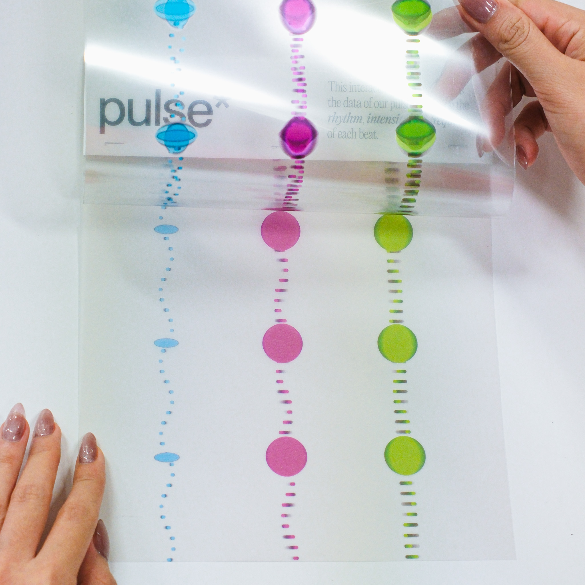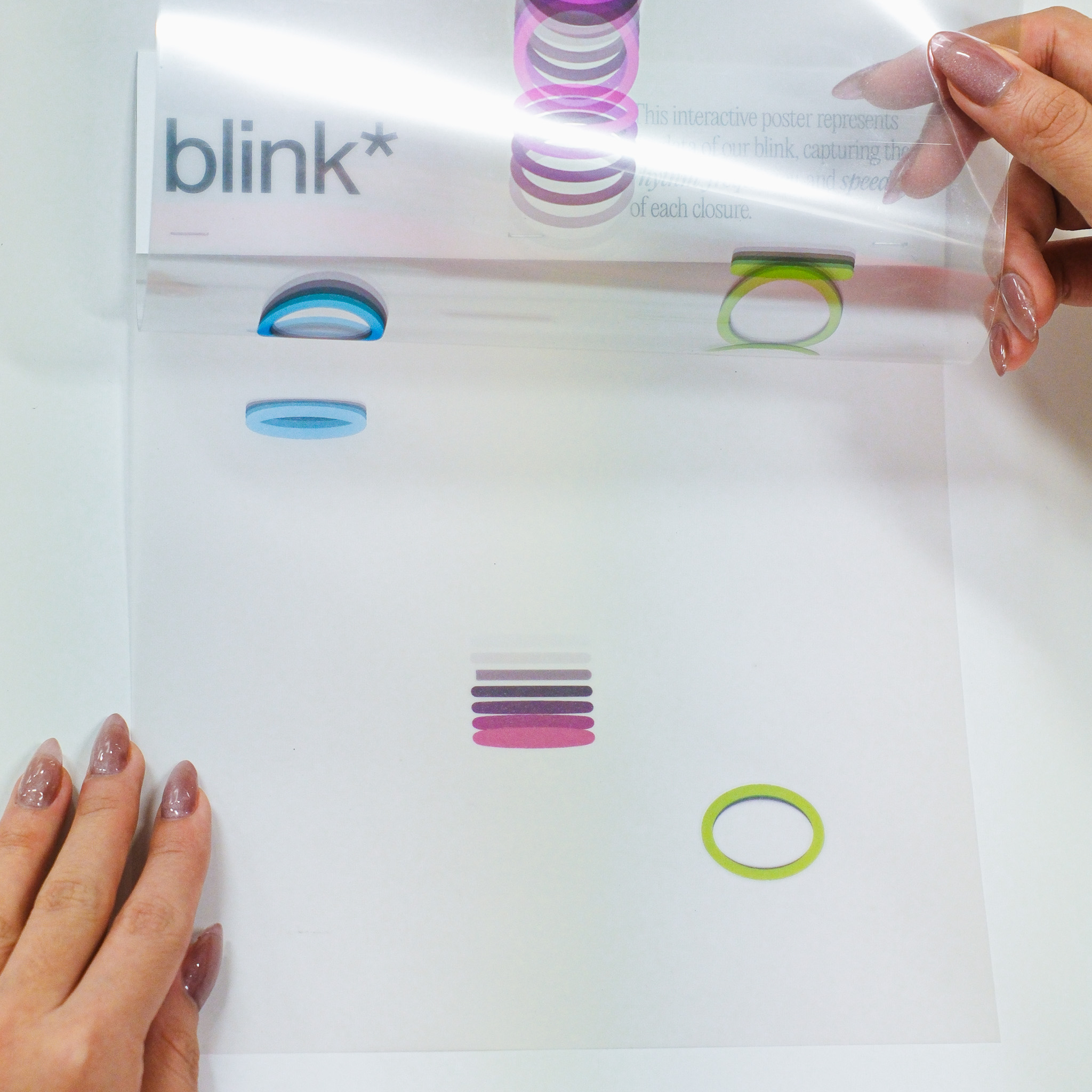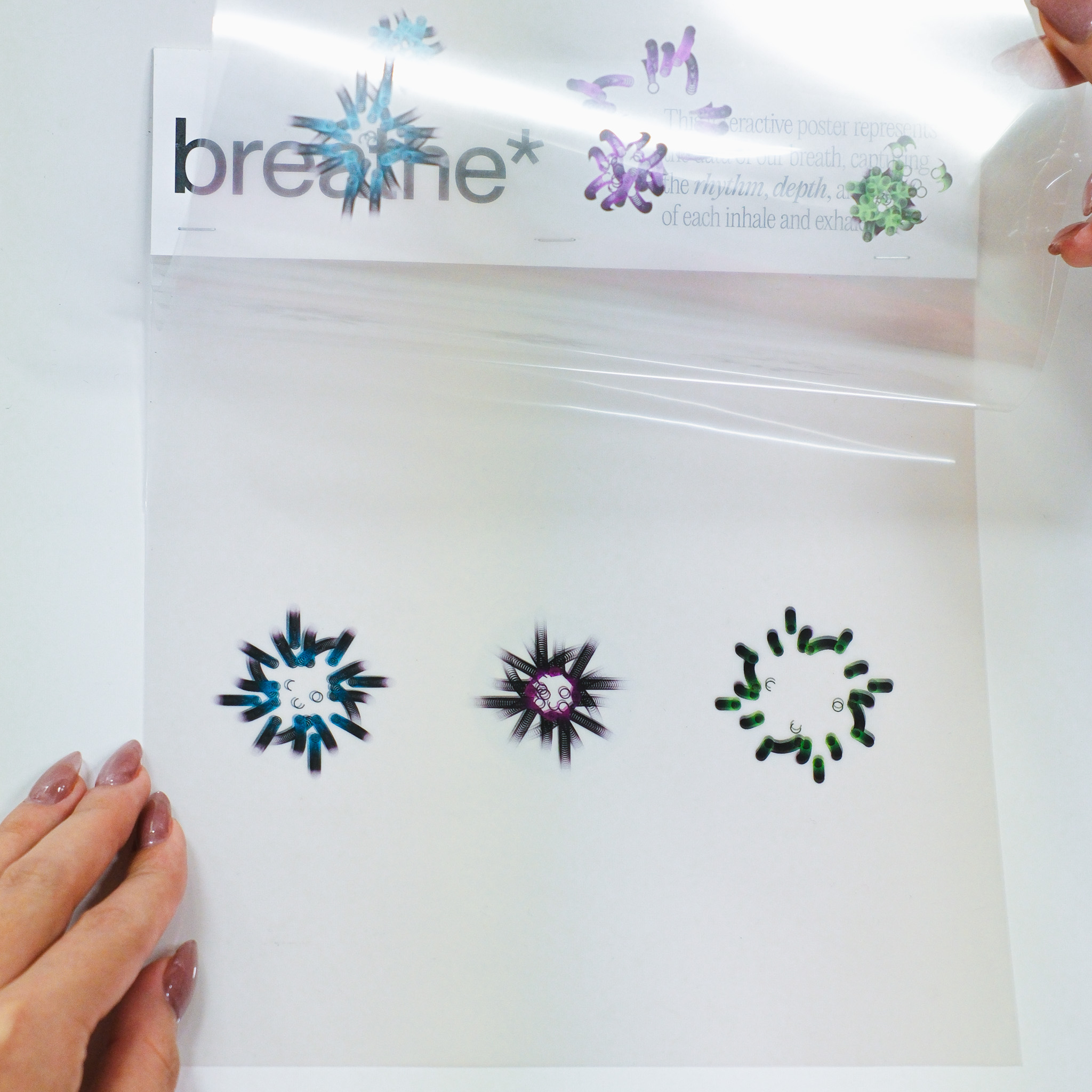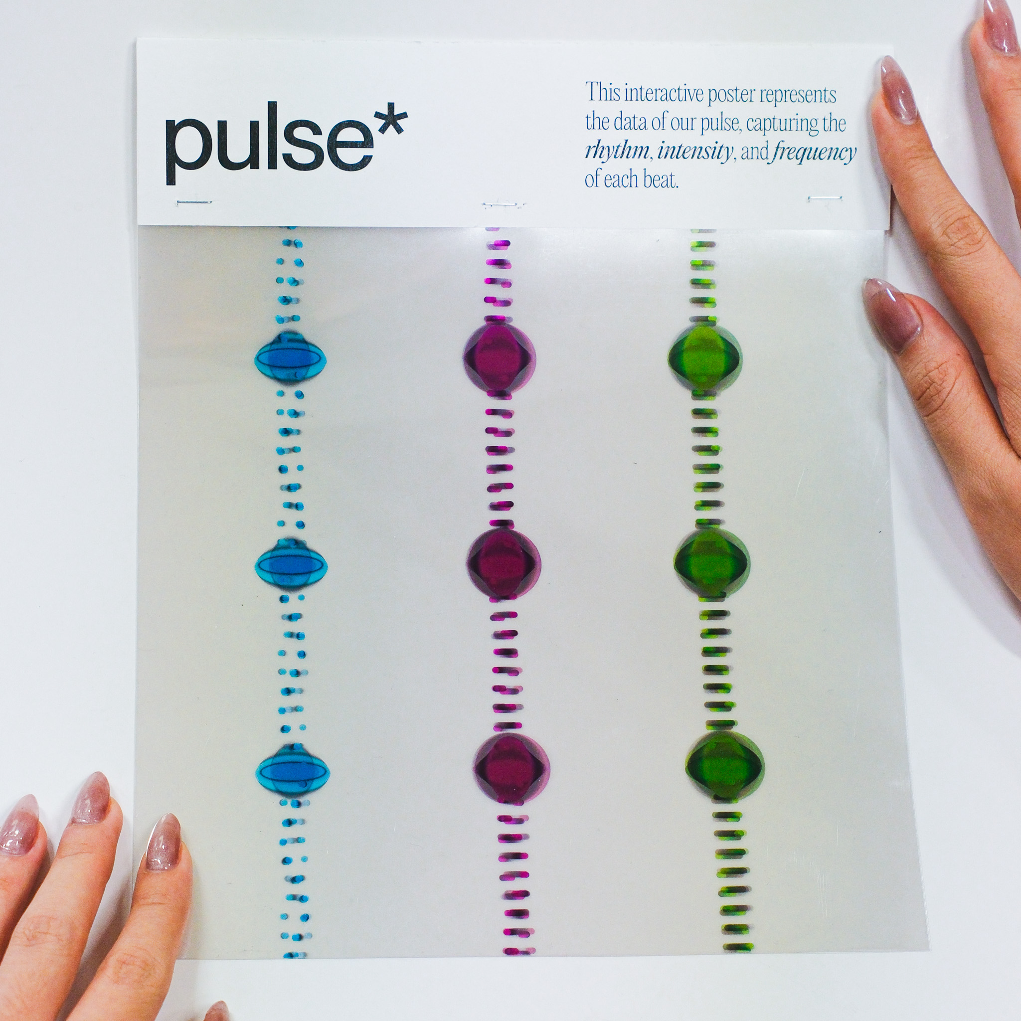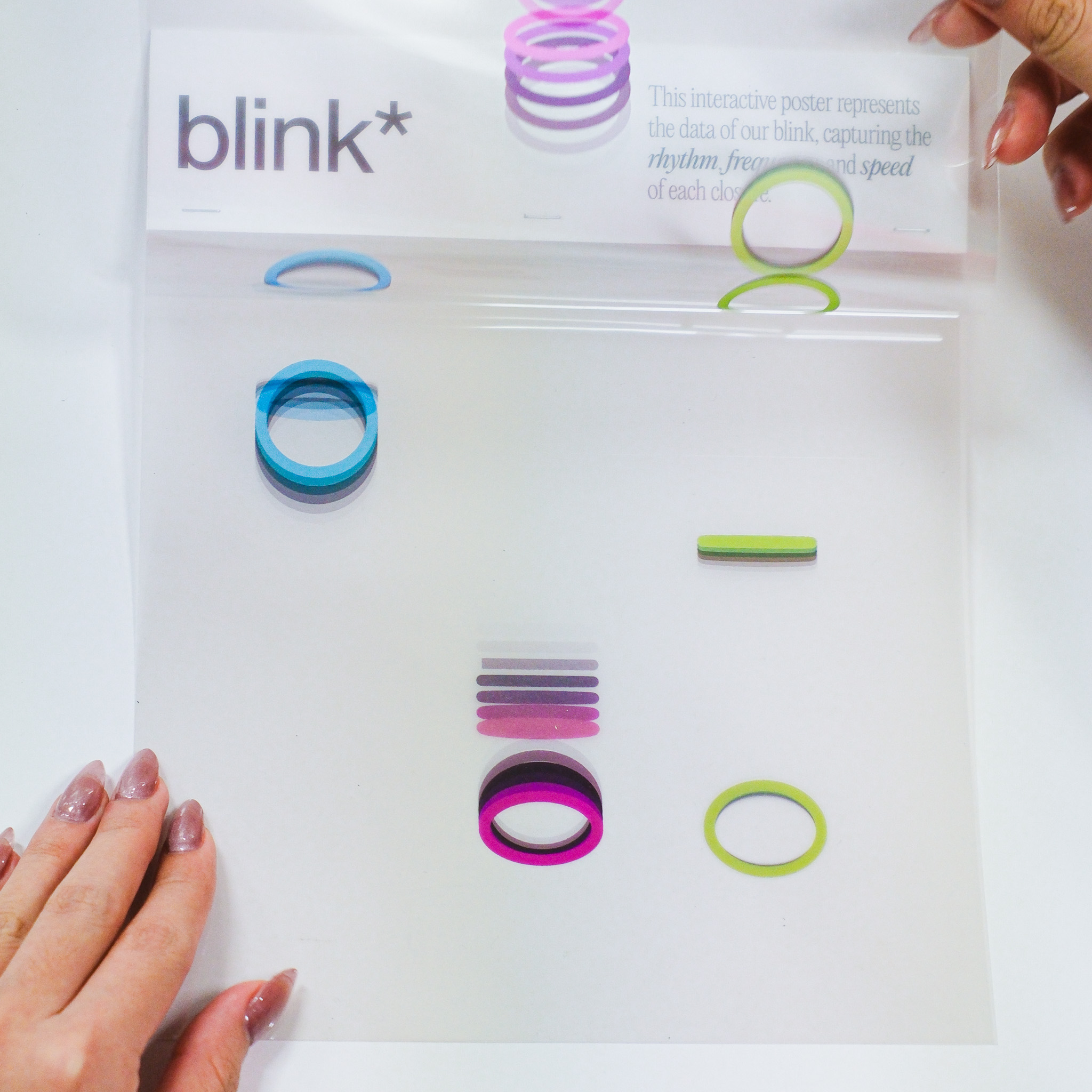 This experiment transforms three distinct data sets—blink, breath, and pulse—into dynamic visual expressions that capture the fluidity and variance in human rhythms. Through changes in speed, rhythm, frequency, intensity, and depth, the visuals illustrate the subtle yet constant fluctuations in our physiological states. In the accompanying series of interactive posters, each element—breath, blink, pulse—is explored individually, offering a unique visual narrative that highlights the difference of each data.