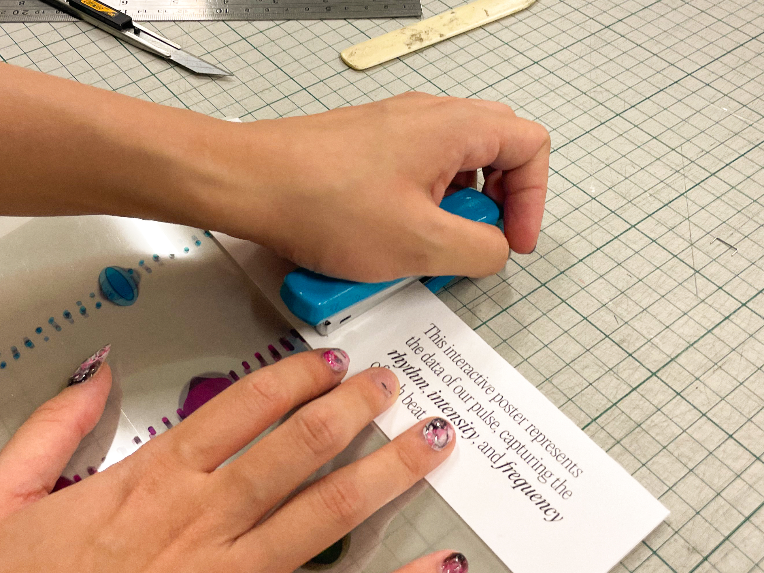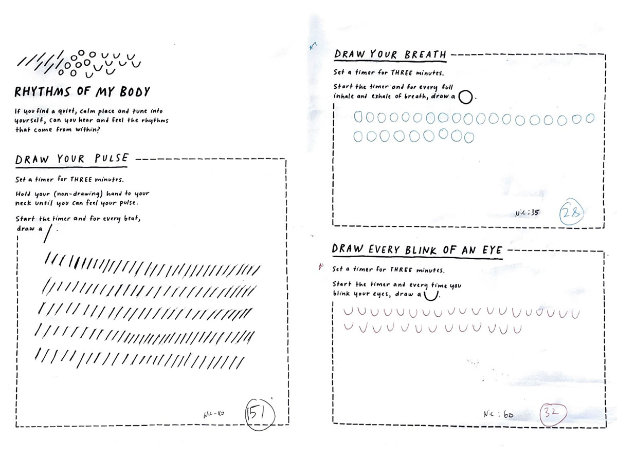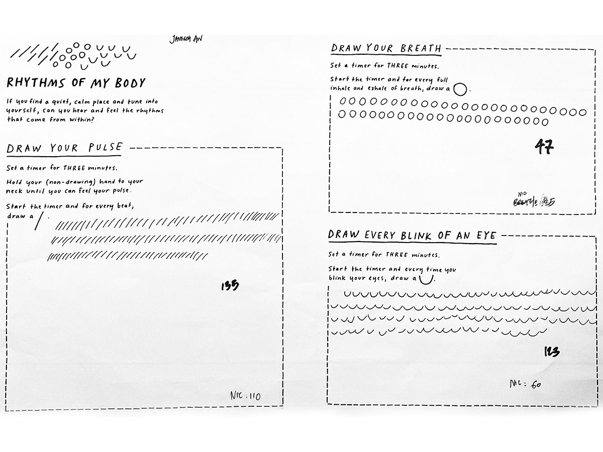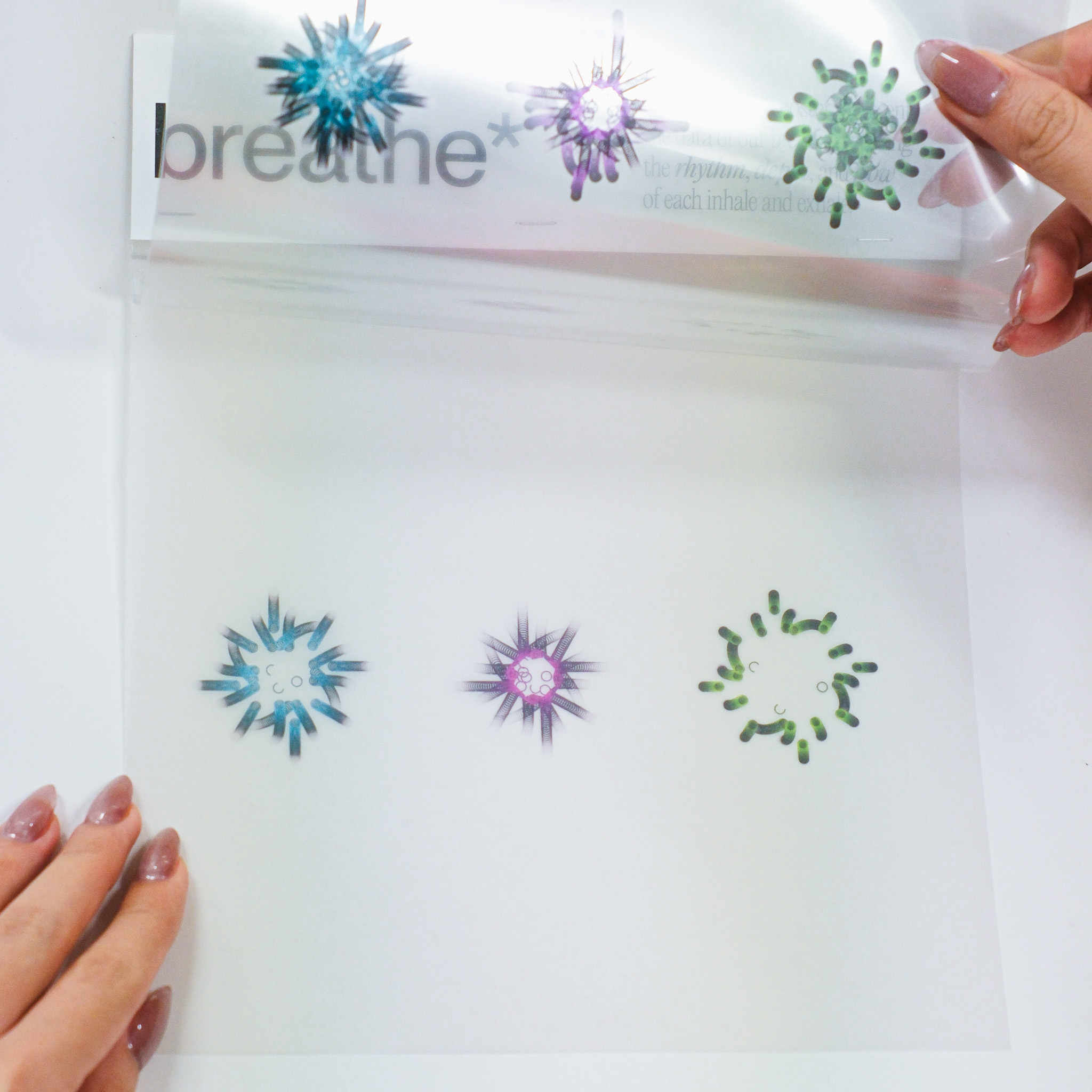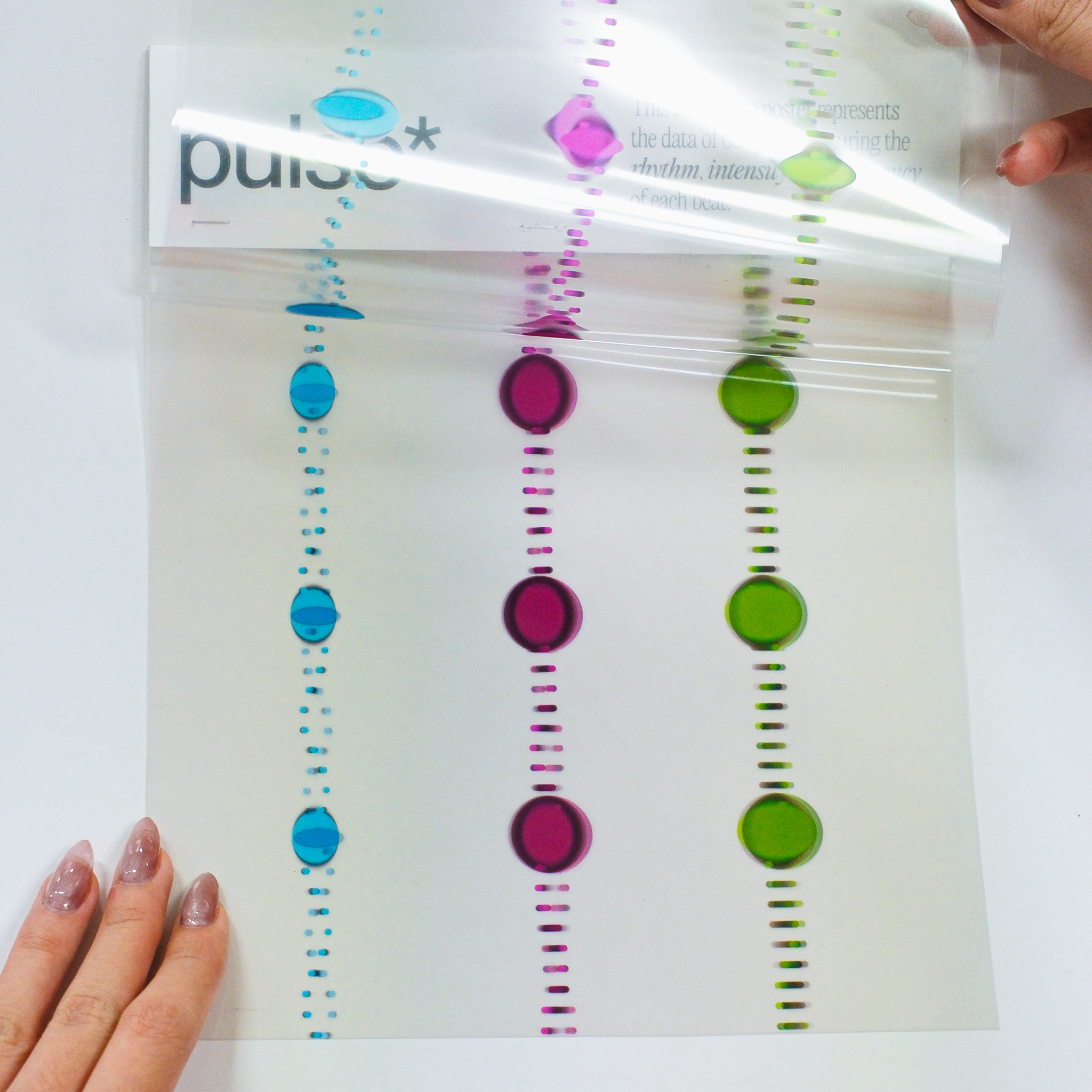 This experiment transforms three distinct data sets—blink, breath, and pulse—into dynamic visual expressions that capture the fluidity and variance in human rhythms. Through changes in speed, rhythm, frequency, intensity, and depth, the visuals illustrate the subtle yet constant fluctuations in our physiological states. In the accompanying series of interactive posters, each element—breath, blink, pulse—is explored individually, offering a unique visual narrative that highlights the difference of each data.