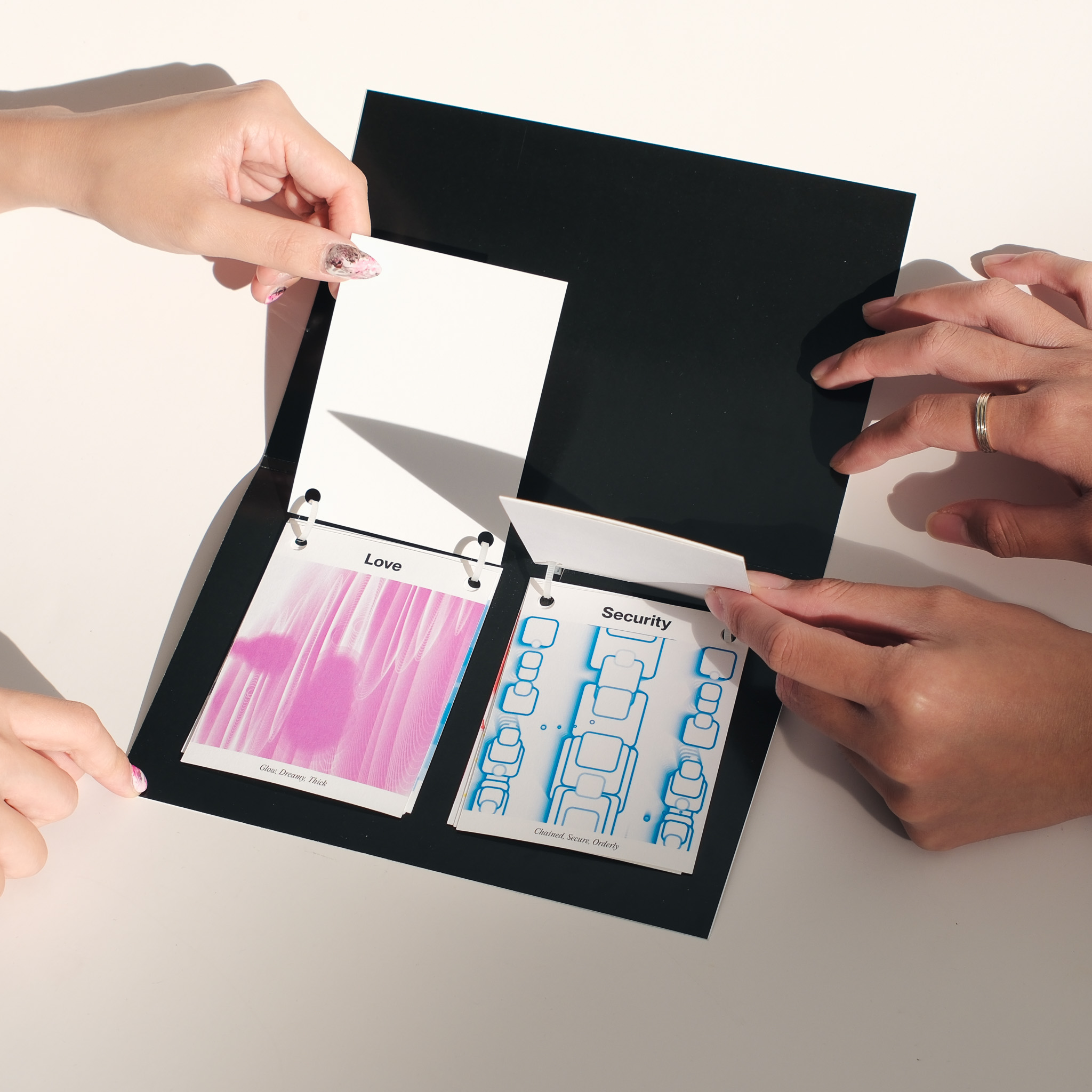 It was an initial struggle to find a binding method for the two mini booklets into the book cover. We ultimately decided to use zip ties to bind the book due to its flexibility and thread it through the mini booklets with carefully placed circular cut outs.